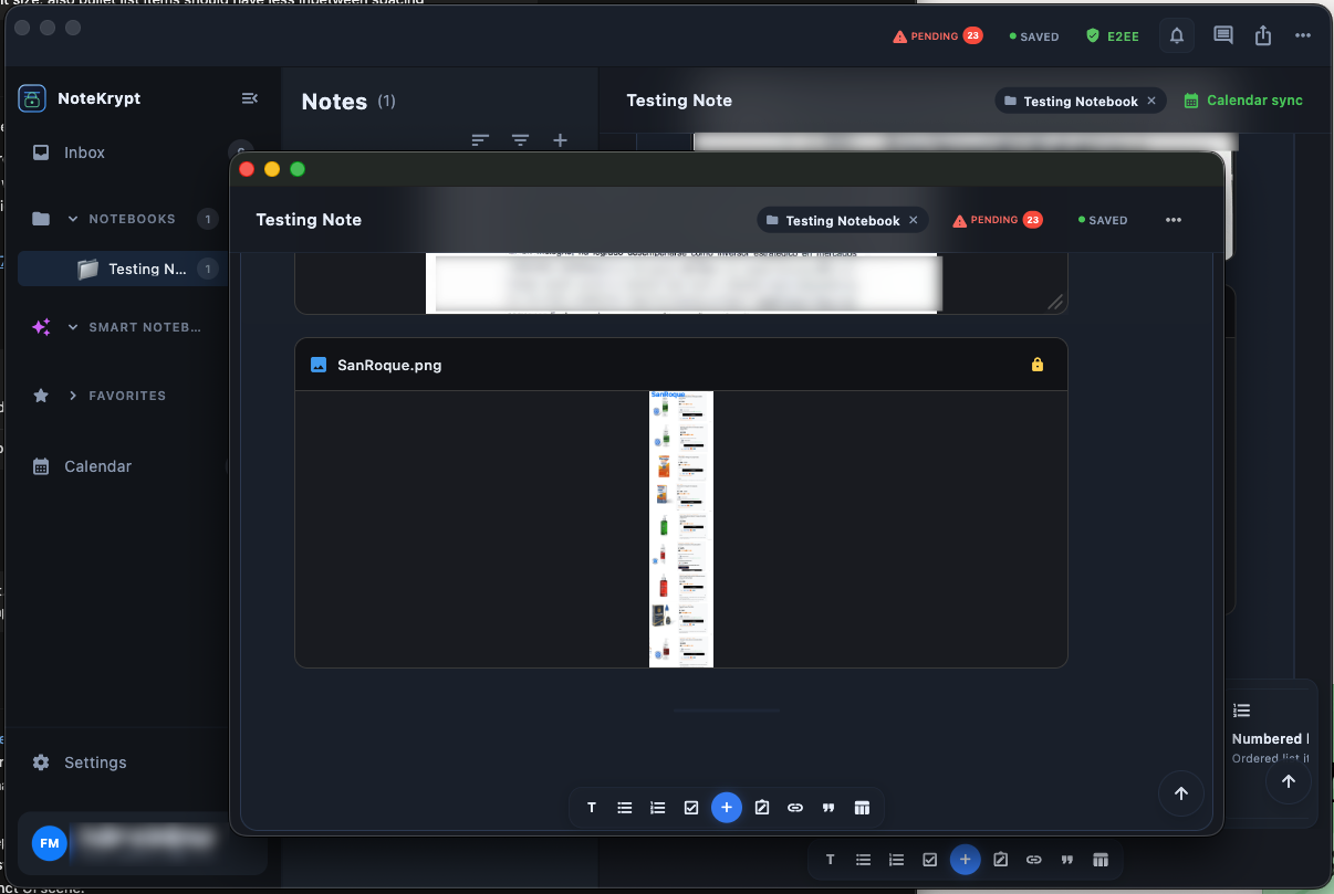 Notes, blocks, and attachments are encrypted before they leave the device, not after they reach the server.